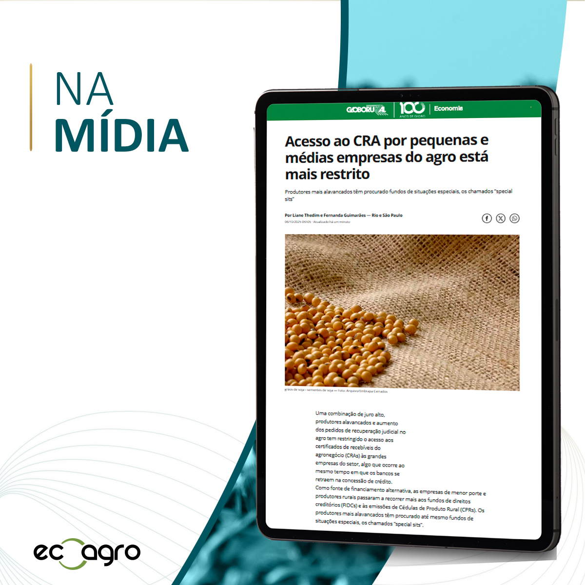 O Valor Econômico abordou o cenário de crédito no agronegócio e as dificuldades de acesso aos CRAs por pequenas e médias empresas.