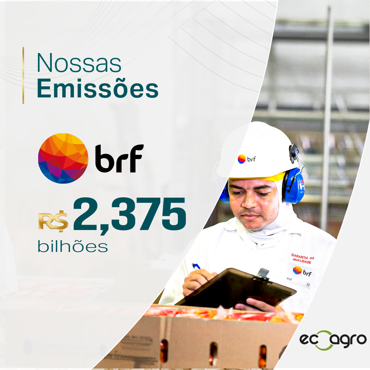 A Ecoagro anuncia uma emissão de 434ª de CRA, no valor de R$ 2.375 bilhões, estruturada ao lado da BRF.